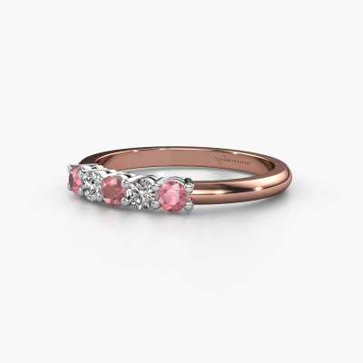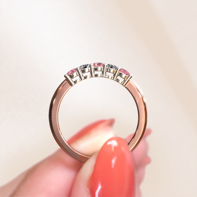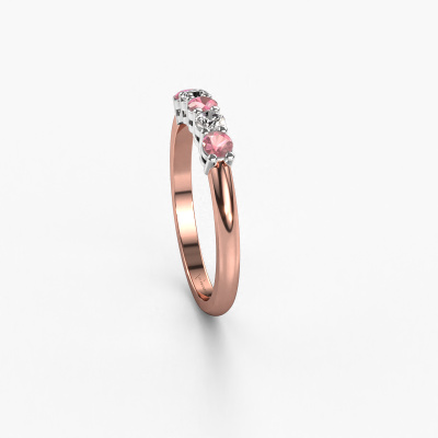 Cette bague style 5 pierres porte le nom de Michelle 5. Ce type de bague s'appelle «Mémoire», car elle est créée avec un profil droit. Cela permet de porter la bague à côté d'autres bagues. Cette bague est en or rose 14 Carat et contient un rose tourmaline associé à une diamant synthétique de 3 mm serties sur l'anneau. Comme vous pouvez le constater, avec cette belle mémoire pour femmes en or rose, de rose tourmaline sont sertis les uns à côté des autres sur la bague. Le sens de l'mémoire est littéralement de 'travailler ensemble'. Et c’est exactement ce que font ces pierres précieuses : ensemble, elles créent un effet spécial supplémentaire sur l'anneau avec un anneau classiques ! Une belle symbolique pour un anneau, non ? Tous les rose tourmaline soigneusement sélectionnés sont placés à la main par notre maître orfèvre. Un travail très précis, qui tire le meilleur parti de notre combinaison unique d'artisanat pur et des techniques d'orfèvre les plus modernes. Toutes les pierres précieuses doivent être serties exactement de la même manière pour diffuser parfaitement la lumière. Par conséquent, l'orfèvre gardera cette bague sous la lumière pour voir si les rose tourmaline sont placés correctement. Cela demande une main habile et beaucoup de patience, mais le résultat est un véritable chef-d'œuvre. Et c'est ce que nous recherchons ! [Bestp1r_long]