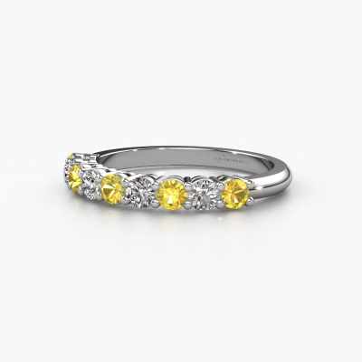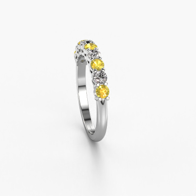 Cette bague style 9 pierres porte le nom de Michelle 9. Ce type de bague s'appelle «Mémoire», car elle est créée avec un profil droit. Cela permet de porter la bague à côté d'autres bagues. Cette bague est en platine et contient un saphir jaune associé à une diamant synthétique de 2.7 mm serties sur l'anneau. Comme vous pouvez le constater, avec cette belle mémoire pour femmes en platine, de saphirs jaunes sont sertis les uns à côté des autres sur la bague. Le sens de l'mémoire est littéralement de 'travailler ensemble'. Et c’est exactement ce que font ces pierres précieuses : ensemble, elles créent un effet spécial supplémentaire sur l'anneau avec un anneau classiques ! Une belle symbolique pour un anneau, non ? Tous les saphirs jaunes soigneusement sélectionnés sont placés à la main par notre maître orfèvre. Un travail très précis, qui tire le meilleur parti de notre combinaison unique d'artisanat pur et des techniques d'orfèvre les plus modernes. Toutes les pierres précieuses doivent être serties exactement de la même manière pour diffuser parfaitement la lumière. Par conséquent, l'orfèvre gardera cette bague sous la lumière pour voir si les saphirs jaunes sont placés correctement. Cela demande une main habile et beaucoup de patience, mais le résultat est un véritable chef-d'œuvre. Et c'est ce que nous recherchons ! [Bestp1r_long] Notre équipe de designers talentueux et passionnés ajoute chaque jour de nouveaux modèles bagues à notre collection en ligne. Notre objectif est de pouvoir vous offrir une grande variété de bijoux. N'hésitez pas à demander un devis si vous avez des souhaits spécifiques pour votre bague. Nous garantissons de vous faire une offre que vous ne pourrez pas refuser. Pour vous faciliter la tâche, vous pouvez facilement nous retourner tout bijou commandé dans les 30 jours suivant la livraison.'