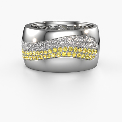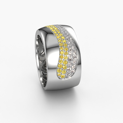 Ria est le nom que nous avons donné à cette bague. Cette bague forgée en or blanc 14 Carat est sertie d'un saphir jaune d'une de 1 mm. Vous recherchez une bague forgée en or blanc unique et au look luxes ? Voici donc une belle bague que vous pouvez aussi ajuster à votre goût. Parfait pour une femmes contemporaine et luxes ! Un beau saphir jaune est incorporé à cette bague larges. Celui-ci est sélectionné avec soin, car seules les plus belles pierres précieuses de votre bague peuvent la briller. Notre orfèvre fabrique votre bague dans notre propre atelier et place le saphir jaune dans l'anneau avec une précision extrême. Donc, la bague est travaillée et polie jusqu'à ce que le résultat soit visible : la bague parfaite !Devez-vous respecter un certain budget ? N'hésitez pas à nous contacter, nous serons heureux de vous conseiller sur toutes les possibilités. Dans tous les cas, nous offrons toutes les bagues à un prix que vous ne trouverez nulle part ailleurs, car nous ne fabriquerons la bague uniquement lorsque vous la commanderez. Cela nous permet de vous donner la garantie du meilleur prix.