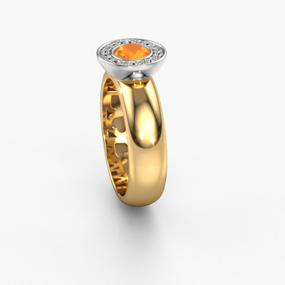 La bague ci-dessus s'appelle Anna et ce type de bague s'appelle une bague Halo. La bague est forgée en or jaune 14 Carat et est sertie d'un citrine ronds de 5 mm comme pierre centrale et de petits diamants sertis autour. Avec cette bague halo pour femmes halo forgée en or jaune, les plus petites pierres précieuses ont été serties autour du gros citrine. Cette bague porte également son nom : halo, qui désigne une guirlande lumineuse formée les pierres précieuses plus petites. Cependant, ces pierre précieuses plus petites doivent toutes être serties de la même manière, afin que la lumière ne soit pas introduite dans le citrine et qu’un véritable halo de lumière soit créé. Voici donc ce que font nos maîtres orfèvres. Avec la plus grande précision, chaque citrine est soigneusement sélectionné et est placé à la main dans la bague. Toujours et encore, la bague est maintenue à la lumière pour voir si l'effet spécial désiré est toujours visible. Le résultat est une bague unique, où le citrine choisi devient littéralement le centre brillants. Une bague magnifique ! Nos orfèvres fabriquent votre bague sur mesure, à votre goût et avec beaucoup de passion et de soin. Le or jaune bague comme indiqué ici peut être ajusté à votre guise avec l'outil de configuration. Si vous avez des idées que vous ne pouvez pas appliquer avec l'outil de configuration, vous pouvez toujours les partager à nos créateurs de bijoux. Vous pouvez bien sûr toujours nous poser des questions.Devez-vous respecter un certain budget ? N'hésitez pas à nous contacter, nous serons heureux de vous conseiller sur toutes les possibilités. Dans tous les cas, nous offrons toutes les bagues à un prix que vous ne trouverez nulle part ailleurs, car nous ne fabriquerons la bague uniquement lorsque vous la commanderez. Cela nous permet de vous donner la garantie du meilleur prix.Pour vous faciliter la tâche, vous pouvez facilement nous retourner tout bijou commandé dans les 30 jours suivant la livraison. Souhaitez-vous concevoir votre bague unique pour femmes Anna, mais certains points ne sont pas encore clairs ? Consultez notre page avec la foire aux questions ou contactez notre équipe de professionnels expérimentés.