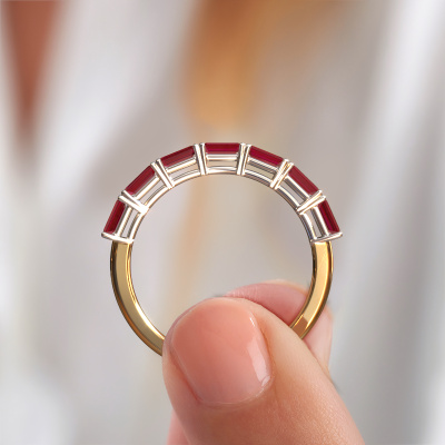 Cette bague unique forgée en or jaune, que nous avons appelée Vivienne half EME, est un pur travail d’art ! La bague est faite d'or 14 Carat et est sertie d'un rubis taille émeraude de 4x2 mm. Les plus petits détails ont été fabriqués avec beaucoup de patience et de passion par notre orfèvre. Ce véritable travail artisanal nécessite un œil expert et une main compétente pour concevoir une bague avec la plus grande précision. Et c'est précisément ce qui enthousiasme nos orfèvres ! Les beaux rubis sont mis en place de manière spéciale, de telle sorte à ce qu'ils sortent encore mieux. Cela donne aux bagues pour femmes une allure supplémentaire. La bague est unique en raison de la pierre précieuse naturelle que nous avons spécialement sélectionnée pour cette bague Vivienne half EME. Et en choisissant votre métal précieux, vous pouvez créer vous-même une bague unique. Une fois que vous avez conçu votre bague Vivienne half EME avec notre configurateur, nos orfèvres se mettent à sa fabrication pour vous. La fabrication se fait de manière traditionnelle avec passion et soin. De plus, nous travaillons avec des matériaux extraits de façon équitable. Si vous voulez changer quelque chose, vous pouvez le faire avec notre configurateur. Si vous avez des souhaits spécifiques pour votre bague Vivienne half EME, mais si vous ne voyez pas une option qui leur corresponde dans le configurateur, veuillez contacter notre équipe de designers expérimentés.En combinant les dernières techniques modernes, associées à une fabrication ancienne, nous sommes en mesure de fabriquer nos bagues dans notre propre studio. Chaque bijou est fabriqué sur commande. Ceci est avantageux car nous sommes en mesure de vous proposer un prix que vous ne trouverez nulle part ailleurs.Pour vous faciliter la tâche, vous pouvez facilement nous retourner tout bijou commandé dans les 30 jours suivant la livraison. Avez-vous des questions ? Souhaitez-vous modifier un design existant avec vos propres idées ? Vous nous donc aussi contacterez. Notre équipe de professionnels se fera un plaisir de vous conseiller dans la création de votre bijou de rêve style uniques.