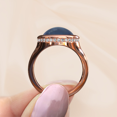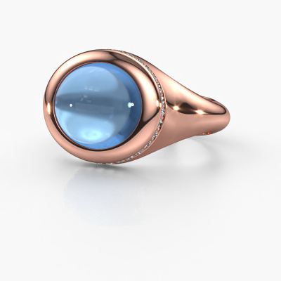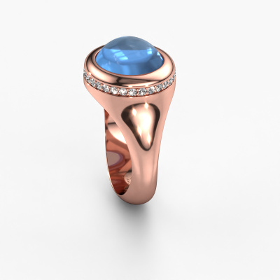 Sur la photo, vous pouvez voir la bague forgée en or rose Lesli OVL avec un topaze bleue cabochon ovale. Le mot cabochon signifie que le topaze bleue est d'abord affûté dans une forme spécifique, telle que la forme d'une goutte, d'un cœur ou cabochon ovale. Puis, des couches sont coupées à parti du haut de la pierre jusqu'à ce que celle-ci obtienne une belle forme convexe. Un bijou avec une pierre précieuse taillée en cabochon est magnifique, attire élégamment tous les regards et correspond parfaitement à un style modernes et plus encore à un style vintage. Votre bague à la mode sera finalisée dans les moindres détails par nos orfèvres jusqu'à ce que votre bague unique soit créée, dans laquelle le topaze bleue cabochon prend tout son sens. Que pensez-vous de cette bague modernes en or rose ? Vous pouvez créer cette bague via notre configurateur. Votre bague personnelle est par la suite fabriquée à la main par nos orfèvres. Le choix du métal précieux et des pierres précieuses peut être entièrement personnalisé. Avez-vous certaines idées pour votre bague, mais vous ne pouvez pas trouver nos options qui leur correspondent ? Alors faites-nous le savoir. Nous fabriquons votre bague personnelle entièrement selon vos souhaits.En combinant les dernières techniques modernes, associées à une fabrication ancienne, nous sommes en mesure de fabriquer nos bagues dans notre propre studio. Chaque bijou est fabriqué sur commande. Ceci est avantageux car nous sommes en mesure de vous proposer un prix que vous ne trouverez nulle part ailleurs.Pour vous faciliter la tâche, vous pouvez facilement nous retourner tout bijou commandé dans les 30 jours suivant la livraison. Bien sûr, vous pouvez toujours nous contacter si vous avez besoin d’aide pour concevoir votre bague Lesli OVL !
