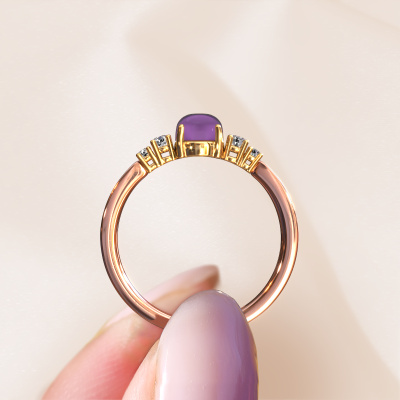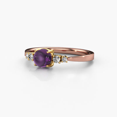 Sur la photo, vous pouvez voir la bague forgée en or rose Regine avec un améthyste cabochon rond. Le mot cabochon signifie que le améthyste est d'abord affûté dans une forme spécifique, telle que la forme d'une goutte, d'un cœur ou cabochon rond. Puis, des couches sont coupées à parti du haut de la pierre jusqu'à ce que celle-ci obtienne une belle forme convexe. Un bijou avec une pierre précieuse taillée en cabochon est magnifique, attire élégamment tous les regards et correspond parfaitement à un style fantaisie et plus encore à un style vintage. Votre bague 5 pierres sera finalisée dans les moindres détails par nos orfèvres jusqu'à ce que votre bague unique soit créée, dans laquelle le améthyste cabochon prend tout son sens. Nos orfèvres fabriquent votre bague sur mesure, à votre goût et avec beaucoup de passion et de soin. Le or rose bague comme indiqué ici peut être ajusté à votre guise avec l'outil de configuration. Si vous avez des idées que vous ne pouvez pas appliquer avec l'outil de configuration, vous pouvez toujours les partager à nos créateurs de bijoux. Vous pouvez bien sûr toujours nous poser des questions.Devez-vous respecter un certain budget ? N'hésitez pas à nous contacter, nous serons heureux de vous conseiller sur toutes les possibilités. Dans tous les cas, nous offrons toutes les bagues à un prix que vous ne trouverez nulle part ailleurs, car nous ne fabriquerons la bague uniquement lorsque vous la commanderez. Cela nous permet de vous donner la garantie du meilleur prix.Pour vous faciliter la tâche, vous pouvez facilement nous retourner tout bijou commandé dans les 30 jours suivant la livraison. Bien sûr, vous pouvez toujours nous contacter si vous avez besoin d’aide pour concevoir votre bague Regine !