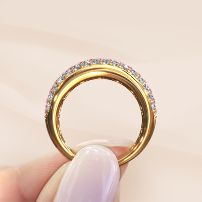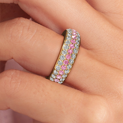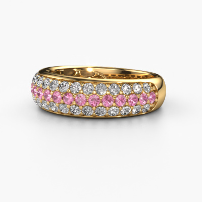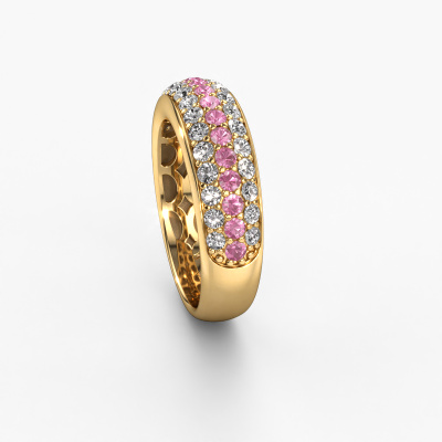 Cette bague Pavé pour femmes porte le nom Emely 8. Cette bague est forgée en or jaune 14 Carat et est sertie d'un saphirs roses de 1.9 mm. Dans cette bague forgée en or jaune, de magnifiques saphirs roses ont été sertis, comme une rangée infinie faite de saphirs roses. Les pierres précieuses sont soigneusement choisies et serties avec la plus grande précision par notre orfèvre. Parce que ce n'est que lorsque les saphirs roses sont sertis les uns à côté des autres que la bague se mettra à briller. Toujours et encore, au cours du processus traditionnel de forgeage et de polissage, l'orfèvre maintient votre bague à la lumière jusqu'à ce qu'il détienne enfin la bague parfaite pour femmes. Composée par vous et spécialement créé pour vous !Nos orfèvres fabriquent votre bague sur mesure, à votre goût et avec beaucoup de passion et de soin. Le or jaune bague comme indiqué ici peut être ajusté à votre guise avec l'outil de configuration. Si vous avez des idées que vous ne pouvez pas appliquer avec l'outil de configuration, vous pouvez toujours les partager à nos créateurs de bijoux. Vous pouvez bien sûr toujours nous poser des questions.En combinant les dernières techniques modernes, associées à une fabrication ancienne, nous sommes en mesure de fabriquer nos bagues dans notre propre studio. Chaque bijou est fabriqué sur commande. Ceci est avantageux car nous sommes en mesure de vous proposer un prix que vous ne trouverez nulle part ailleurs.Pour vous faciliter la tâche, vous pouvez facilement nous retourner tout bijou commandé dans les 30 jours suivant la livraison.. Bien entendu, nous sommes heureux de vous aider à créer votre bague de rêve Emely 8. Si vous avez des questions, n'hésitez surtout pas à nous contacter !