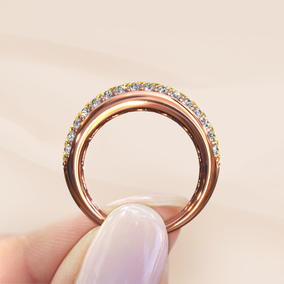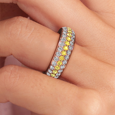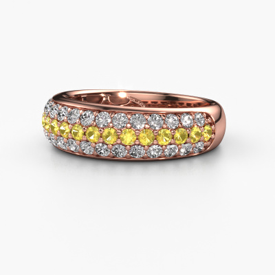 Cette bague Pavé pour femmes porte le nom Emely 8. Cette bague est forgée en or rose 14 Carat et est sertie d'un saphirs jaunes de 1.9 mm. Dans cette bague forgée en or rose, de magnifiques saphirs jaunes ont été sertis, comme une rangée infinie faite de saphirs jaunes. Les pierres précieuses sont soigneusement choisies et serties avec la plus grande précision par notre orfèvre. Parce que ce n'est que lorsque les saphirs jaunes sont sertis les uns à côté des autres que la bague se mettra à briller. Toujours et encore, au cours du processus traditionnel de forgeage et de polissage, l'orfèvre maintient votre bague à la lumière jusqu'à ce qu'il détienne enfin la bague parfaite pour femmes. Composée par vous et spécialement créé pour vous !Nos orfèvres fabriquent votre bague sur mesure, à votre goût et avec beaucoup de passion et de soin. Le or rose bague comme indiqué ici peut être ajusté à votre guise avec l'outil de configuration. Si vous avez des idées que vous ne pouvez pas appliquer avec l'outil de configuration, vous pouvez toujours les partager à nos créateurs de bijoux. Vous pouvez bien sûr toujours nous poser des questions.En combinant les dernières techniques modernes, associées à une fabrication ancienne, nous sommes en mesure de fabriquer nos bagues dans notre propre studio. Chaque bijou est fabriqué sur commande. Ceci est avantageux car nous sommes en mesure de vous proposer un prix que vous ne trouverez nulle part ailleurs.Pour vous faciliter la tâche, vous pouvez facilement nous retourner tout bijou commandé dans les 30 jours suivant la livraison.. Bien entendu, nous sommes heureux de vous aider à créer votre bague de rêve Emely 8. Si vous avez des questions, n'hésitez surtout pas à nous contacter !