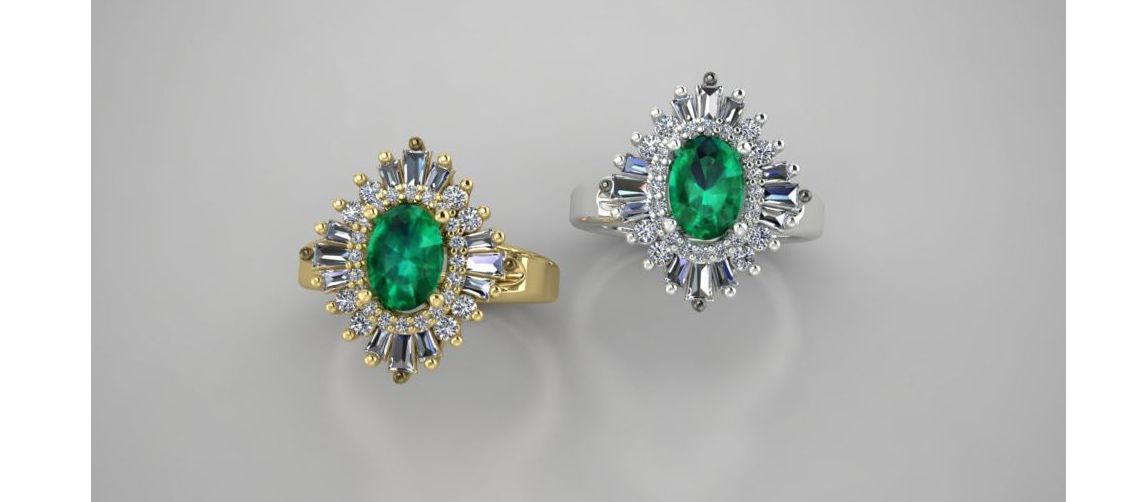 La bague finalement choisie en or jaune 14K est sertie d'une émeraude de forme ovale 7×5 et est entourée de diamants de différentes formes pour un poids total de 0,50 carats.